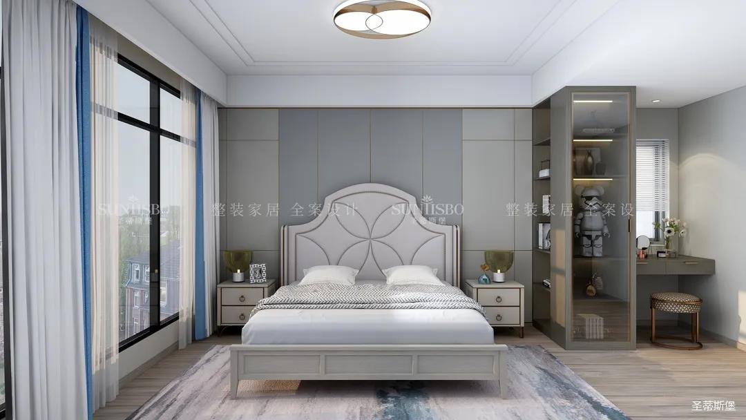 主臥的設計,整體風(fēng)格與色調的一致,通過(guò)空間設計與軟裝細節的調控,顯得主臥多了一份寧靜與放松。四照花床屏的細節、材質(zhì)色彩的把握、隔斷小書(shū)桌的設計,無(wú)不體現著(zhù)設計師獨特的品位和全案設計的能力。