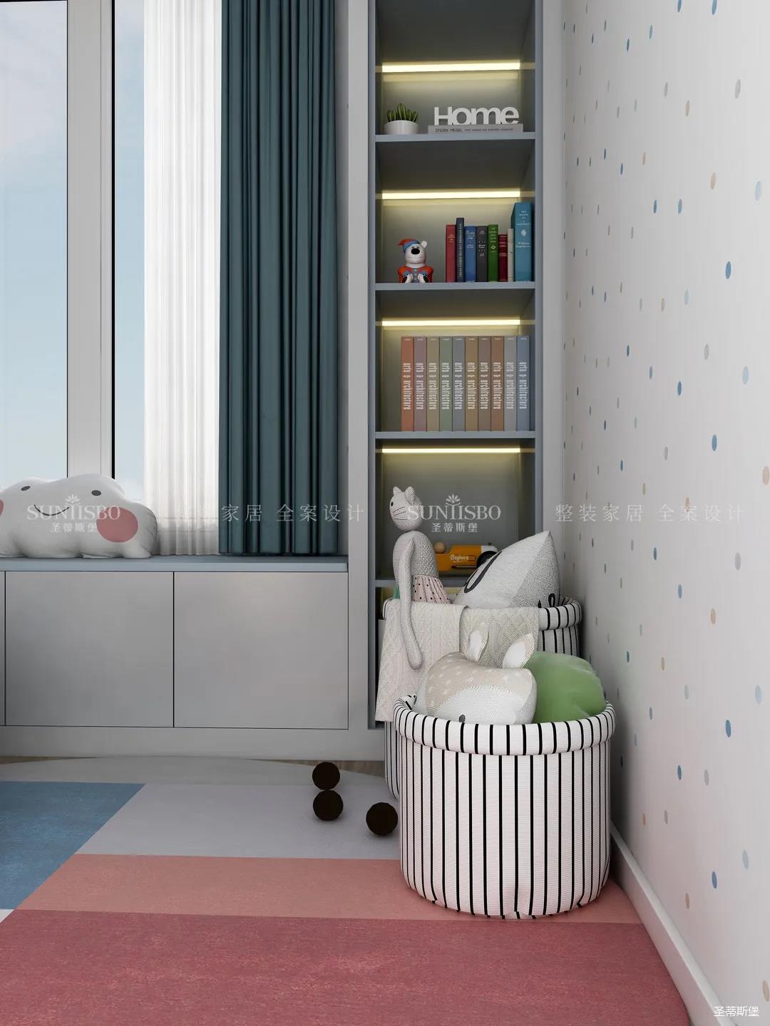 兒童房追求的是童真與自然,柜體的色彩與軟裝搭配完美呼應,云朵山峰的背景墻,以特立獨行的設計在視覺(jué)上讓心靈得到放空的意境。沿窗打造的飄窗格局,增加空間的功能性,造型簡(jiǎn)約的柜體根據家裝理念摒棄了繁復的設計,更多展現的是空間自然之美。