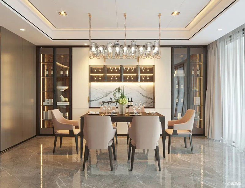 餐廳的裝飾平時(shí)都比較簡(jiǎn)單,所以對于燈飾的藝術(shù)性與功能性要求較高,主要是追求照明清晰和營(yíng)造溫馨浪漫的氛圍。一般都是以安裝吊燈為主,聚集餐廳燈光的中心點(diǎn),安裝在餐桌的正上方,照明和提升美感兩不誤。