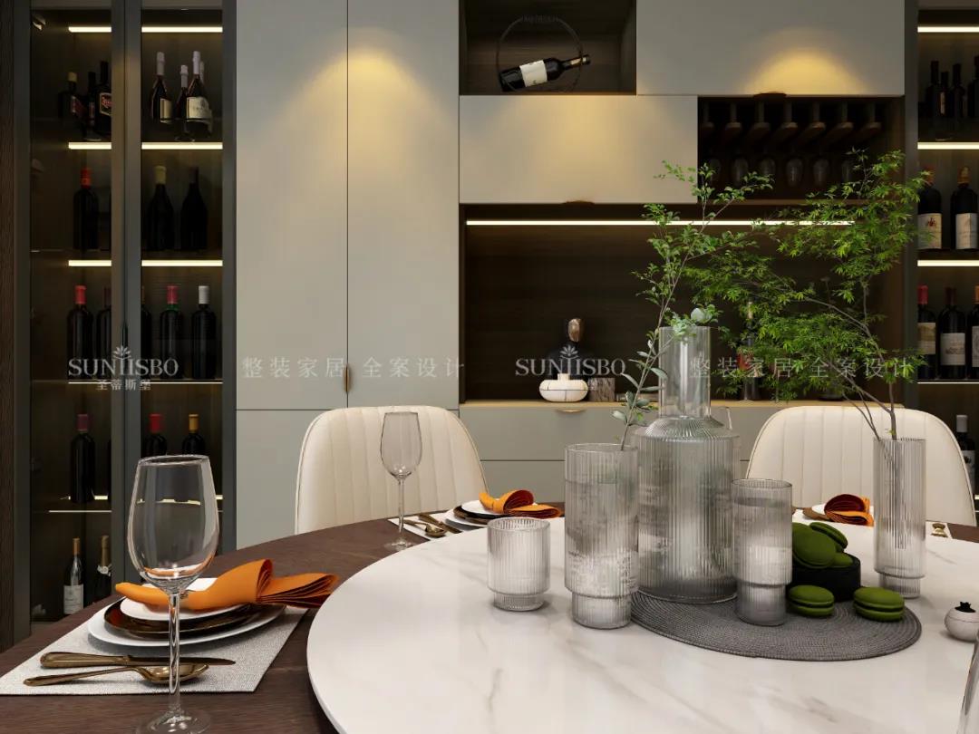 移步到餐廳空間,餐邊柜立面簡(jiǎn)致,紋理細膩,展示區合理分配,增強了空間層次感,彰顯出飽滿(mǎn)的意式美感。實(shí)木柜面加以金屬拉手的裝飾,將極簡(jiǎn)現代與高端質(zhì)感融合,以簡(jiǎn)約的形式表達出“簡(jiǎn)而不失其華”的感染力。